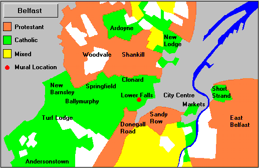 This map indicates the location of the Bobby Sands mural, Sevastopol Street and Falls Road, Belfast: