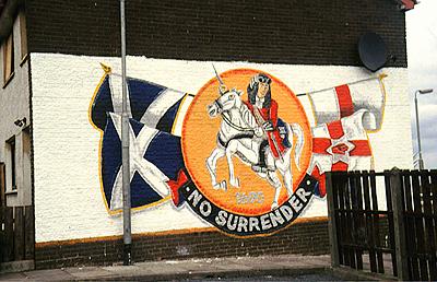 King Billy MuralThe first loyalist mural was painted on the Beersbridge Road in Belfast in 1908. For most of the rest of the twentieth century loyalist murals were painted each July as part of the annual ritual celebrations of the Battle of the Boyne in 1690, when King William III (King Billy) defeated King James II in a struggle over the English crown. Consequently, the main image in the murals was of King Billy on his white horse crossing the River Boyne. By the 1970s and 1980s this image became much less frequent. There was a brief revival of King Billy murals in 1990, the tercentenary of the Battle of the Boyne. Today King Billy murals are rare. One recent example is on the Kilcooley estate in Bangor, County Down, painted in September 1997. Location and Date: Kilcooley, Bangor, County Down, 1997