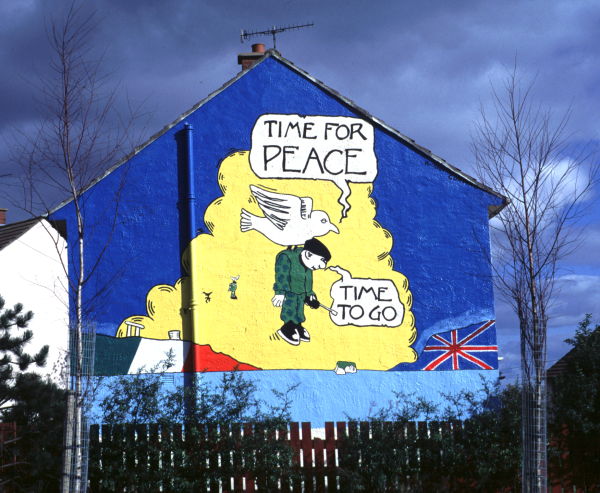 During the mid to late 1980s, militaristic murals were common in republican areas; butr as the ceasefire of August 1994 approached, a noticeable change occurred. Many murals displayed the message that it was time for peace and therefore time to go for the British army. Often the message was conveyed light-heartedly, as in one mural painted on the Whiterock Road, West Belfast, in the early summer of 1994. From that point on, militaristic images in republican murals became practically non-existent. In their place were demands for the release of prisoners, the disbandment of the police force, the Royal Ulster Constabulary (RUC), and the departure of British soldiers.
