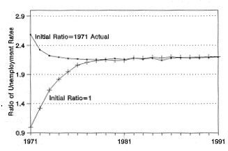 ![]() The second cumulative impact begins with the single factor, 'Catholic disadvantage in hiring' of 20%. This is shown as the lowest curve in Figure 7 and reproduces simulation 3 from Table 4. As can be seen, this factor acting alone produces a stable unemployment ratio of close to 1.45. With the addition of differential quit rates the equilibrium ratio rises to 1.66. The higher quit rate for Catholics might reflect Catholic disadvantage, or alternatively could be related to structural factors such as the younger average age of the Catholic workforce. A stable unemployment ratio somewhere between 1.45 and 1.66 might thus represent the impact of Catholic disadvantage and is of considerable interest. A stable unemployment ratio at this level would be close to that predicted from most cross-section studies of 'structural' disadvantage for Catholics, ie around half of the observed unemployment ratio. Since it is most appropriate to view ratios as multiplicative a 50% influence on the unemployment ratio is best measured as the square root of the ratio. In this case the square root of 2.2 is 1.5.