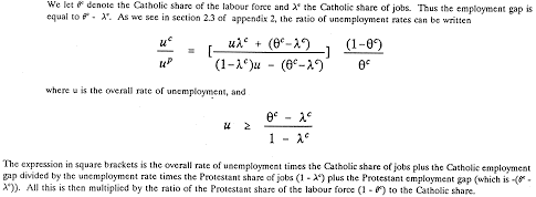 ![]() And clearly the ratio will be bigger the larger is the difference in unemployment rates (uc - up) as a proportion of the Protestant rate. [4] These figures apply in a context of Catholic share of the economically active at 39%. Although the precise figures vary a little for the different shares of the economically active, the changes are minimal for small variations in the labour force share. [5] Here we give a general description of the model: more details and the full mathematical specification are contained in appendix 3. [6] The allocation of job losses is discussed in more detail in appendix 3. [7] An identity is an equation which holds true by definition. For instance, the definition of labour force as the sum of the employed and unemployed (L= E+ U) is an identity. [8] In reporting these figures we have allocated those respondents to the 1971 census who refused to state their religion to one or the other community grouping using Compton's assumptions about the distribution of the 1971 'Not Stated' respondents. In allocating the 1991 'Not Stated' and 'No Religion' groups we have used estimates based on work carried out at the Northern Ireland Economic Research Centre. [9] These three groups are defined in more detail as follows. Those who have just vacated jobs are individuals who have left a job in the current year: likewise new entrants are those who enter the labour force for the first time in the current year. The unemployed are thus defined as all those who were job seekers in the previous year (being at that time either unemployed, a new entrant or having just vacated a job) but did not acquire a job in the previous year. [10] This is encouraging since it suggests that the fact that we have not nude finer distinctions according to the length of time a person has been unemployed will not be a significant omission. [11] Since Catholics now get only 80% of the jobs they would if jobs were allocated according to the value of S alone, it follows that Protestants must get proportionately move jobs than they would if the sharing mechanism, S, were the only factor determining how jobs are allocated. Roughly, if Catholics have a 20% disadvantage relative to strict proportionality, as here, this translates into a Protestant advantage, of 16%, again relative to proportionality. This is discussed in greater detail in appendix 3. [12] The observed rates of natural increase for Catholics and Protestants over the period 1971-91 would result in a stable unemployment ratio of 2.4 under conditions of no labour turnover. This occurs when all other factors (migration, quit rates, disadvantage in hiring) are equal between communities.