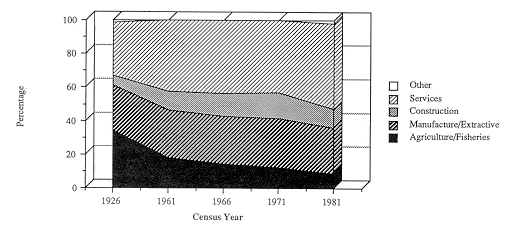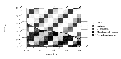 There exist numerous accounts of the development and structure of Northern Ireland's economy. Rather than attempt a synthesis of this published material, this section will chart some of the broad features of the development of the economy. The main part of the section will examine the changing pattern of industry in Northern Ireland using information from the 1926, 1961, 1966, 1971 and 1981 censuses. A much more detailed picture of the structure of the economy in recent years can be gained from Eversley (1989), in particular in the Additional Tables for that book published by the Fair Employment Agency. The final part of the section will point to some of the demographic characteristics highlighted by Eversley as relevant to the economy.
