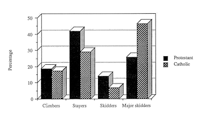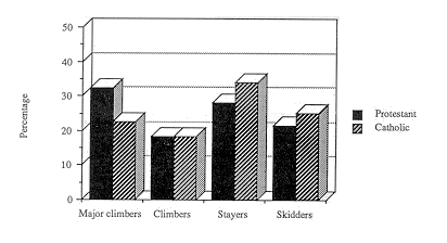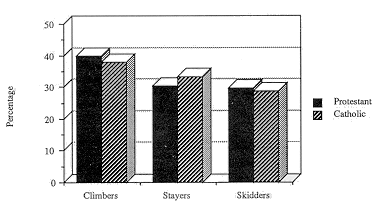 Miller's conclusions are illustrated in figures 5.1 to 5.3. Figure 5.1 shows the overall pattern of movement for Protestants and Catholics in three categories: 'climbers' are where sons were at a higher occupational level than their fathers; 'stayers' are where the occupational levels of fathers and sons were the same; and 'skidders' are where sons were at a lower occupational level than their fathers. As figure 5.1 shows, the overall patterns of movement for Protestants and Catholics were fairly similar.