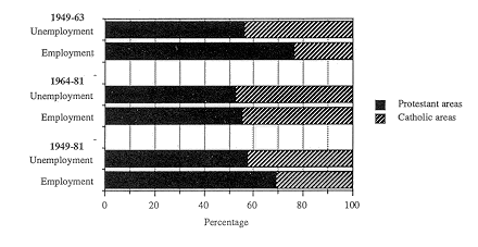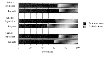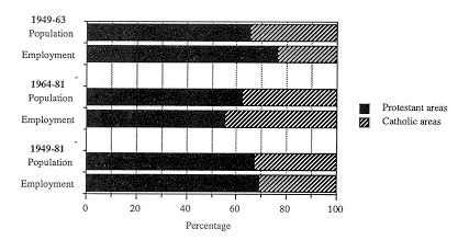 Protestants and Catholics are not evenly distributed throughout Northern Ireland (Compton, 1978) and so the location of industry can effect employment opportunities for the two communities. The symbolic representation of this issue focuses on the River Bann which roughly divides Northern Ireland into two halfs, the mainly Catholic west of the Bann and the mainly Protestant east of the Bann. Government policy towards inward investment and sponsored employment has been subject to a number of studies given that this is one area where some empirical evidence on claims of discriminatory treatment of different regions of Northern Ireland is available.