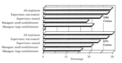 It was possible to compare the proportions of Protestants and Catholics in managerial and supervisory positions for both the 1971 and 1981 censuses. Osborne and Cormack found a gender and religious pattern for both census years such that men were more likely than women, and Protestants were more likely than Catholics, to be in managerial and supervisory positions. In 1981, for example, 9.4% of employed men were in managerial positions compared with 3.1% of employed women.