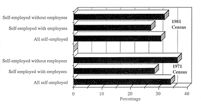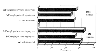 However, there is a religious difference between the self-employed with and without employees: Catholics are slightly under-represented among the larger concerns, ie self-employed with employees, and this is true for men and women. Comparing the proportions for 1971 and 1981 suggests that self-employment among Catholics declined in all categories and for both sexes, although on the available information it is not possible to offer any explanation for this pattern.