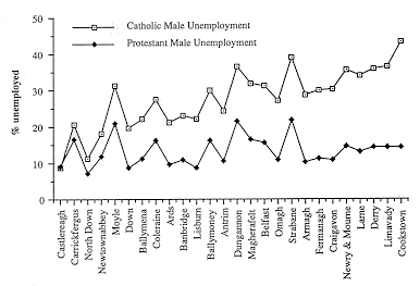 remain unemployed. Compton (1981: Ppl38-141) has argued most forcefully for the first of these explanations. He showed that if the rate of population increase in 1975/6 remained constant until the year 2000, then a little over twice as many Catholic men as Protestant men would reach an economically active age. He went on to show that even if Catholics and Protestants had an equal chance of finding employment, this would still result in a Catholic rate of male unemployment that was three times greater than that of Protestant men. This argument can be illustrated in the following way: let us assume there is a working population with a majority group (P) of 100 people and a minority group (C) of 50 people. Over a period of time let us assume that the population increases by 50, but these new entrants have only an 80% chance of obtaining employment: of these 50 new entrants 40 will be employed and 10 will be unemployed. If the fertility level of the minority group (C) is higher than that of the majority group (P), then the number of new entrants will be proportionately higher for C than P: in this case let us assume that of the 50 new entrants 20 are from P and 30 are from C. If all the new entrants have an 80% chance of getting a job, then of the 20 new entrants to P. 16 will get jobs; and of the 30 new entrants to C, 24 will get jobs. Thus the total populations of P and C will be 120 and 80 respectively, but 116 from P will have jobs and 74 from C will have jobs. Considered another way, of the 120 from P, 4 will be unemployed (3.3%), while of the 80 from C, 6 will be unemployed (7.5%). Thus, even though there was equal opportunity in obtaining employment, because the minority group (C) was increasing at a faster rate, the unemployment level in that group was over twice that of the majority group (P). While Compton's model presents a dramatic illustration of the impact of differential population growth on employment opportunity it has been challenged in a number of respects. Firstly Eversley (1989) has pointed out that growth rates have declined for both Protestant and Catholic populations in Northern Ireland. Thus, while the current Catholic rate remains higher than the Protestant rate, this is at a much lower overall level of childbirth: in other words, rates of increase are not static and are unlikely to remain static. Secondly, Compton's model relied on an assumption that unemployment was zero at the start and rose over the period examined. Smith (1 987) has pointed out that for the model to be accurate, it would also imply that in a period of falling unemployment, ie. unemployment high at the start and falling over the period examined, then Catholic unemployment would fall much faster than Protestant unemployment: in other words, if population was the only, or predominant factor, and Catholic population growth remained higher than that of Protestants, then Catholics would gain a disproportionate benefit in a situation of falling unemployment. There is no evidence that this has happened in Northern Ireland (although see section 11). Eversley (1989) has argued further that explanations based on differential fertility levels ignore the time-lag between birth and labour market entry: Those who attempt to make the connection seem to overlook that time lag between birth and labour market entry - a period which becomes longer as children stay longer in full-time education. The further we go back in the post-war evoultion of the Northern Irish population, the stroller the share of Catholics in both the child and the adult working age-groups; yet the excess unemployment was always there. This is another reason why it is not legitimate to blame Catholic fertility for the present heavy imbalance. (Eversley, 1989, p221).Perhaps the most significant criticism is that the model assumes that unemployment results from new entrants to the labour market thus ignoring the impact of labour turnover within the market. All models involve some degree of simplification of actual processes, but in this case the model may present an over-simplification of labour market processes. Osborne and Cormack (1989 Pp42-44) have pointed out, for example, that between 1971 and 1981 almost 90% of the net total labour force growth was accounted for by an increase in female economic activity rates. Alternatively, Gudgin et al. (1990) have provided a detailed examination of the wide range of processes involved in the labour market in relation to unemployment levels, including internal labour market mobility and movement in and out of Northern Ireland. The poverty trap An explanation based on the poverty-trap has been proposed by Doherty (1981: Ppl22-3). Doherty suggested that, of his sample of Belfast unemployed, almost a quarter fell into a category that was characterised by an average of three dependent children, a low level of skill and very low earnings potential while in employment. Furthermore, he suggested that the proportion of unemployed who received more while unemployed than while employed was higher in Belfast than in three comparable English towns. Although Doherty had no data on the religion of individual members of his sample, he suggested that the characteristics of those caught in the poverty-trap were more likely to be found among Catholics than Protestants. This, he suggested, "may help to account for some of the link between unemployment and Catholic religious affiliation" (pl23). A later study of a sample of unemployed men drawn from across Northern Ireland (Miller and Osborne) 1983: Pp86-87). which did identify individuals' religion, drew two conclusions which seemed to counter Doherty's suggestions. Firstly, Miller and Osborne showed that the proportion who received benefit close to previous earnings was rather small (less than 8%): in other words, only a small proportion of the unemployed seemed to fall within the danger-zone of the poverty trap. Secondly, Miller and Osborne found that of this group, a