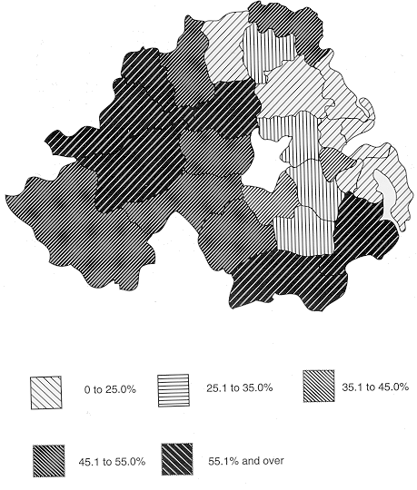 Figure 5.1 Percentage of Catholics, based on 1981 Census figures and adjustments by Compton (1986), district council areas