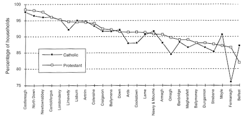 A similar approach was taken to the data on the provision of public water supply and public sewer. The supply of public services to dwellings tends to be dependent on how remote they are with those in rural areas being less likely to have water and sewer facilities. An examination of the data on connection to the public water supply revealed that the greatest disparity tended to be among those councils where the overall provision is lowest. Due to the effect of the urban/rural spread it is not possible to say whether the lower rate of provision, for example, among Catholic households in Fermanagh, is on account of more Protestant households living in urban areas. Information on the availability of central heating within dwellings was collected for the first time during the 1981 Census. Figure 5.5 shows the distribution of central heating across the 26 district council areas. It is clear that there is a disparity between areas which may be partly accounted for differences in the tenure mix. Whatever the cause the data reveal a moderate negative association between the number of Catholic households in an area and the availability of central heating.