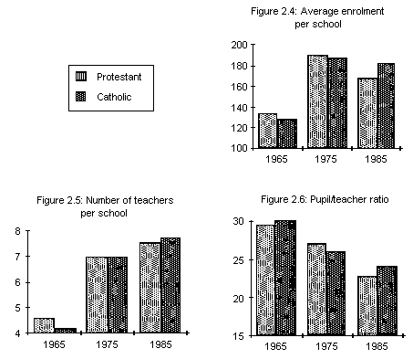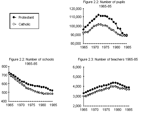 Background On the 31st December, 1985, there were just over 165,000 pupils aged five years and over in some 1,000 primary schools in Northern Ireland; 3,687 of these pupils were in the preparatory departments of grammar schools. Of this total number of pupils only 65 were twelve years of age while none were older. These pupils were taught by 7,902 teachers (DENI Statistics). This is in marked contrast to the situation in the late 1940s, the first years in which pupils could take advantage of the 1947 Education Act and attempt to qualify for a non-fee paying place in a grammar school. In 1949, for example, there were just under 186,000 pupils in over 1,600 primary schools. Of this total number of pupils almost 32,000 were twelve years of age or older, of whom almost 3,000 were fourteen years of age or older. These pupils were taught by almost 6,000 teachers (Ministry of Education, Northern Ireland, Statistics). The number of primary school pupils peaked in 1956 and in 1972, from which time enrolments have declined although the rate of decline flattened out in the latter half of the 1980s. By contrast, the number of primary schools has steadily declined so that the average size of each school increased up until the late 1970s. The change that occurred in primary education between 1948 and 1986 can be traced directly to the 1947 Act, Prior to this, most children in Northern Ireland received their entire education in Public Elementary schools. After 1947 post-primary education was to be made available to all pupils, but until sufficient new schools were built, it was not, in practice, available (see Section 4). Hand in hand with the construction of new secondary schools went the reorganisation of primary schools into the contemporary pattern with a theoretical (and barring a small number of exceptions, actual) upper age limit of eleven years Identifying Protestant and Catholic primary schools Reorganisation of the primary schools took some time and was not fully completed until the 1970s. For example, in 1963 there were 437 unreorganised primary schools (out of a total of 1,442 schools), in 1966 there were 215 such schools and by 1969 only 81 such schools remained. Unreorganised primary schools took pupils over the age of eleven years until such time as secondary school places were locally available. For the present study, the main significance of this is that differentiating between 'Protestant' and 'Catholic' primary schools is unreliable before the mid-1960s. Having said this, the Ministry of Education published details of the religious affiliation of pupils until 1964 (see Akenson, 1973). Until 1969 there were three types of school catering for primary-age children: controlled and voluntary schools, and preparatory departments of grammar schools. The controlled primary schools were almost exclusively Protestant while the voluntary schools were predominantly, but not exclusively Catholic. Unreorganised voluntary primary schools included some church-endowed schools (mainly Church of Ireland) that had not yet transferred to Ministry of Education control. From 1969 onwards Catholic voluntary primary schools became increasingly organised as maintained voluntary primary schools. As such, the separate category of voluntary primary schools rapidly declined: in 1986, for example, there were only 311 pupils in voluntary primary schools. For this reason the structural comparison between Protestant and Catholic primary schools below is based on data from 1965 onwards. This comparison assumes that controlled primary schools can be considered to be Protestant schools, while voluntary or maintained voluntary primary schools can be considered to be Catholic schools (for further discussion on this issue see Darby. 1973, Darby et al.. 1977, Murray, 1978 and Greer, 1983). The relative accuracy of this categorisation can be gauged from the 'Schools Apart?' study (Darby et al., 1977). Of 150 primary and post-primary schools responding to a survey it was found that over 95% of Protestant schools had less than 5% Catholic enrolment and over 98% of Catholic schools had less than 5% Protestant pupils. Similarly, of 750 primary school teachers in the survey, only 3 were employed in schools of different religion. There has been no reported research on more recent circumstances. Preparatory Departments The structural comparison of primary schools below does not include pupils in the preparatory departments of grammar schools. The number of such units has declined over the years (for example, 44 units in 1965 compared with 29 units in 1985) while the number of pupils has declined from a peak of just over 5,500 pupils in 1971 to just under 4,000 pupils in 1986. Although these pupils are not included in the discussion below, it should be noted that by the 1980s all the preparatory departments were to be found within Protestant grammar schools. This is of particular significance given that pupils in preparatory departments are more likely to qualify for grammar school places in the 11+ transfer procedure (Sutherland and Gallagher, 1986). Pupils, teachers and schools Figures 2.1 to 2.3 present some basic information on the changing patterns in Protestant and Catholic primary schools between 1965 and 1985. Figure 2.1 indicates the pattern of pupil enrolment showing, for both school types, an increasing population until the early 1970s followed by decline. The rate of decline among Catholic schools appears to have been smaller than that among Protestant schools and from 1983 onwards the decline among the former appears to have been arrested. One effect of this is that in 1985 there were more pupils enrolled in Catholic primary schools than in Protestant primary schools.