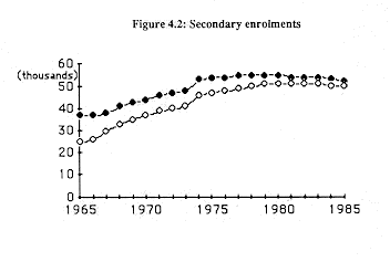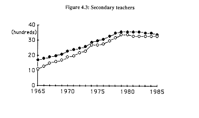 Between 1965 and 1975 the average enrolment increased in both sectors, but while the average enrolment of Catholic secondary schools increased slightly between 1975 and 1985, among Protestant secondary schools the average enrolment declined. Figure 4.5 presents the average number of teachers per school for both sectors and while this has increased over the years, the rate of increase has been higher among Catholic secondary schools. Thus in 1985 the average number of teachers employed in Catholic secondary schools was almost equal to that of Protestant secondary schools.