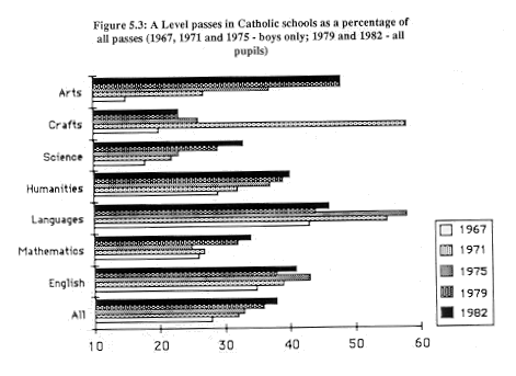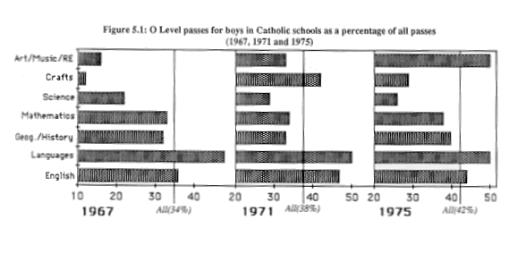 each of the years. ![]() Between 1967 and 1975 a number of points can be noted from these figures. Firstly, the proportion of 0 Level passes for boys in Catholic schools remained higher in languages than their overall rate of passing. From a disproportionately low rate of passes in 1967 in art/music/religious education, boys in Catholic schools achieved a disproportionately high rate of passes in these subjects in 1975. This may be primarily related to their results in religious education (see below). The rate of passes among these pupils fluctuated for crafts subjects. By contrast, the reverse was true for science subjects where boys in Protestant schools achieved a disproportionately high rate of passes in each of the years. It should be noted also that the proportion of passes achieved by boys in Catholic schools overall increased over these years.