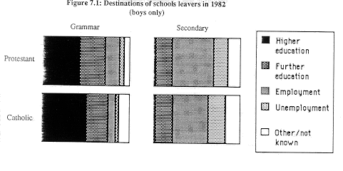 Unit (PPRU) (McWhirter et al., 1987; McWhirter, 1989). The most striking common finding from the FEA studies was that a higher proportion of the pupils leaving Protestant schools were in employment whereas a high proportion of those leaving Catholic schools were enrolled in Government Training Centres, were unemployed or had decided to return to school. In addition to this a high proportion of the Protestant school leavers in both studies had obtained their employment through family contacts. In the Belfast study this method of gaining employment was also common among the pupils leaving Catholic schools. However, as employment was higher generally among Protestants in the catchment areas of these schools, those pupils leaving Protestant schools were in a more advantageous position to use personal contacts. A further common feature of both studies was the disillusionment of school leavers with education. Before entering the labour market many had been convinced that the possession of some qualifications would enhance their employment opportunities, a hope that for many was not realised. In addition, many of those who finally decided to return to full-time education did so for apparently negative reasons, i.e. because they could not find a job.