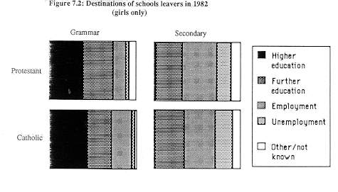 ![]() Among girl leavers from secondary schools more leaving Protestant schools went into employment, while more leaving Catholic schools were known to be unemployed. For these pupils also, the final destinations were unknown for a higher proportion of the Protestant school leavers.