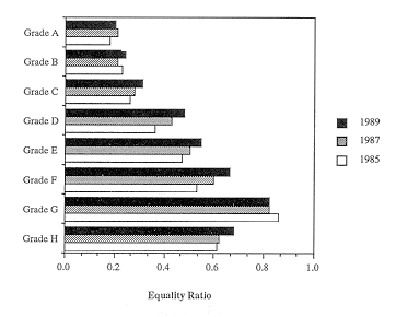 ![]() An equality ratio is derived by finding the relative rate of employment of members of two social groups, in this case Protestants and Catholics. Thus, a ratio of 1.0 would imply that equal numbers of Protestants and Catholics were being employed, while a ratio of less than 1.0 would imply that more Protestants than Catholics were being employed. Two conclusions are evident from figure 11.1. Firstly, it is clear that while relatively large numbers of Catholics were employed in the more junior grades of the NICS, relatively few were employed at the more senior grades. Secondly, across the five years covered by these data there was an increase in the employment of Catholics, especially from grade F up to grade C; however, there was no clear pattern of improvement at the two most senior grade levels. Both conclusions are in accord with the most recent assessment of equal opportunities in the NICS (Osborne, 1990). Figure 11.1 is included as an example of the way equality ratios can be used to illustrate patterns of employment between two groups both across grade levels and across time. In this case the data were based on those employed in the NICS although it would be possible also to derive equality ratios for recruitment or promotion figures. The monitoring system introduced by the 1989 Act will not, however, produce a complete picture of the labour market in Northern Ireland. On the one hand the monitoring information excludes a number of groups, including those working in small firms and part-time workers, ie those working less than sixteen hours per week. An FEA investigation into employment patterns in the (London)Derry area (FEA, 1983) suggested that employment in small firms may play an important role in the assessment of the labour market in a particular area. Similarly, the exclusion of part-time workers from monitoring specifically excludes many women workers. The total number of excluded workers will amount only to a minority of the total employed workforce, but it will place limitations on what can be deduced about the operations of the labour market overall. A further limitation is that multi-site companies will file only a single monitoring return: this will allow for analysis of the labour market at a province-wide level, but inhibit analysis at sub-regional levels (it should be noted that the FEC can request monitoring information for each site: DED, 1989, p17). Having pointed to some weaknesses in the monitoring data itself, we can now go on to consider a number of potential difficulties in the analysis of monitoring data. The first difficulty lies in the fact that the availability of data need not imply that all analysts will reach the same conclusions regarding its interpretation. This can be best illustrated by an example. In 1985 the FEA published an investigation of the Northern Ireland Civil Service. The FEA concluded that the proportion of Catholics in the NICS had been very low before 1968, but had increased substantially in the 1970s. Although Catholics were not adequately represented at the key policy-making levels of the NICS, the FEA report contained analyses which suggested that Catholics were moving up the promotional ladder. However, these conclusions were criticised in a series of articles (Miller, 1985, 1988). Miller, who had been a consultant to the FEA on the NICS investigation, claimed that analyses he and others had carried out on the data had pointed to a quite different conclusion, ie that "the imbalances in favour of Protestants could persist well into the next century" (Miller, 1988s p4). The terms of this debate -had very technical aspects, including the relative merits of log-linear versus analysis of variance techniques, but it is included here merely to illustrate the point that different analysts can arrive at different conclusions despite using the same dataset. It should only be added that, following the FEA investigation, the NICS established an Equal Opportunities Unit which has produced three monitoring reports (data from which was used above, cf. figure 11. 1) allowing for further examination of employment and recruitment patterns in the NICS (Osborne, 1990; although see McCusker, 1985).,In addition, the Equal Opportunities Unit has been willing to bring problems identified by its monitoring into the public domain (see, for example, Harbison, 1990). A further difficulty lies in the limited information on religious affiliation, population and labour availability in local areas, against which monitoring returns can be compared. In the United States a 'total availability estimate' is used which includes such factors as minority population, minority unemployment, minorities with requisite skills and availability for training (Whitfield, 1989, p29). By contrast, in Northern Ireland only a limited number of published Government social statistics (eg census information, CHS data) are routinely disaggregated by religion. Given this relative lack of baseline comparative information in Northern Ireland it may be that the monitoring data itself could be used to compare religious patterns in workforces in particular areas. There is, however, another view that labour availability data may not be appropriate insofar as they describe a situation which is a reflection of past discrimination (Edwards, 1990, p25).