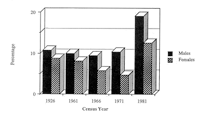 Proportions 'out of work' While the figures above indicate the type of industries within which the working population was employed, the censuses also provide information on the proportion of economically active persons who were out of employment (figure 2.3). In 1926 the proportions of those available for work but out of employment were 11% of men and 9% of women. The proportion of men out of work hovered around the 10% mark for each of the 1961, 1966 and 1971 censuses, while that for women dropped from 8% in 1961 to 5% in 1971. Between 1971 and 1981, however, the proportions out of work rose considerably reaching 19% for men and 13% for women.