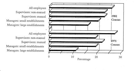 It was possible to compare the proportions of Protestants and Catholics in managerial and supervisory positions for both the 1971 and 1981 censuses. Osborne and Cormack found a gender and religious pattern for both census years such that men were more likely than women, and Protestants were more likely than Catholics, to be in managerial and supervisory positions. In 1981, for example, 9.4% of employed men were in managerial positions compared with 3.1% of employed women.