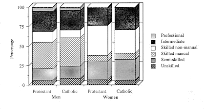 When the unemployed were excluded from the analysis it was found that the social class distributions of the two groups were quite similar, as is illustrated by figure 7.4: for men the main differences were in the higher proportion of Protestants in the skilled non-manual category (14% vs. 10%) and the higher proportion of Catholics in the unskilled category (8% vs. 6%). For women there were a higher proportion of Catholics in the intermediate (29% vs. 22%) and semi-skilled categories (27% vs. 24%), and a higher proportion of Protestants in the skilled non-manual category (39% vs. 30%).