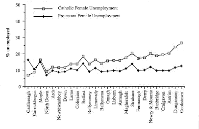 remain unemployed. Compton (1981: Ppl38-141) has argued most forcefully for the first of these explanations. He showed that if the rate of population increase in 1975/6 remained constant until the year 2000, then a little over twice as many Catholic men as Protestant men would reach an economically active age. He went on to show that even if Catholics and Protestants had an equal chance of finding employment, this would still result in a Catholic rate of male unemployment that was three times greater than that of Protestant men. This argument can be illustrated in the following way: let us assume there is a working population with a majority group (P) of 100 people and a minority group (C) of 50 people. Over a period of time let us assume that the population increases by 50, but these new entrants have only an 80% chance of obtaining employment: of these 50 new entrants 40 will be employed and 10 will be unemployed. If the fertility level of the minority group (C) is higher than that of the majority group (P), then the number of new entrants will be proportionately higher for C than P: in this case let us assume that of the 50 new entrants 20 are from P and 30 are from C. If all the new entrants have an 80% chance of getting a job, then of the 20 new entrants to P. 16 will get jobs; and of the 30 new entrants to C, 24 will get jobs. Thus the total populations of P and C will be 120 and 80 respectively, but 116 from P will have jobs and 74 from C will have jobs. Considered another way, of the 120 from P, 4 will be unemployed (3.3%), while of the 80 from C, 6 will be unemployed (7.5%). Thus, even though there was equal opportunity in obtaining employment, because the minority group (C) was increasing at a faster rate, the unemployment level in that group was over twice that of the majority group (P). While Compton's model presents a dramatic illustration of the impact of differential population growth on employment opportunity it has been challenged in a number of respects. Firstly Eversley (1989) has pointed out that growth rates have declined for both Protestant and Catholic populations in Northern Ireland. Thus, while the current Catholic rate remains higher than the Protestant rate, this is at a much lower overall level of childbirth: in other words, rates of increase are not static and are unlikely to remain static. Secondly, Compton's model relied on an assumption that unemployment was zero at the start and rose over the period examined. Smith (1 987) has pointed out that for the model to be accurate, it would also imply that in a period of falling unemployment, ie. unemployment high at the start and falling over the period examined, then Catholic unemployment would fall much faster than Protestant unemployment: in other words, if population was the only, or predominant factor, and Catholic population growth remained higher than that of Protestants, then Catholics would gain a disproportionate benefit in a situation of falling unemployment. There is no evidence that this has happened in Northern Ireland (although see section 11). Eversley (1989) has argued further that explanations based on differential fertility levels ignore the time-lag between birth and labour market entry: Those who attempt to make the connection seem to overlook that time lag between birth and labour market entry - a period which becomes longer as children stay longer in full-time education. The further we go back in the post-war evoultion of the Northern Irish population, the stroller the share of Catholics in both the child and the adult working age-groups; yet the excess unemployment was always there. This is another reason why it is not legitimate to blame Catholic fertility for the present heavy imbalance. (Eversley, 1989, p221).Perhaps the most significant criticism is that the model assumes that unemployment results from new entrants to the labour market thus ignoring the impact of labour turnover within the market. All models involve some degree of simplification of actual processes, but in this case the model may present an over-simplification of labour market processes. Osborne and Cormack (1989 Pp42-44) have pointed out, for example, that between 1971 and 1981 almost 90% of the net total labour force growth was accounted for by an increase in female economic activity rates. Alternatively, Gudgin et al. (1990) have provided a detailed examination of the wide range of processes involved in the labour market in relation to unemployment levels, including internal labour market mobility and movement in and out of Northern Ireland. The poverty trap An explanation based on the poverty-trap has been proposed by Doherty (1981: Ppl22-3). Doherty suggested that, of his sample of Belfast unemployed, almost a quarter fell into a category that was characterised by an average of three dependent children, a low level of skill and very low earnings potential while in employment. Furthermore, he suggested that the proportion of unemployed who received more while unemployed than while employed was higher in Belfast than in three comparable English towns. Although Doherty had no data on the religion of individual members of his sample, he suggested that the characteristics of those caught in the poverty-trap were more likely to be found among Catholics than Protestants. This, he suggested, "may help to account for some of the link between unemployment and Catholic religious affiliation" (pl23). A later study of a sample of unemployed men drawn from across Northern Ireland (Miller and Osborne) 1983: Pp86-87). which did identify individuals' religion, drew two conclusions which seemed to counter Doherty's suggestions. Firstly, Miller and Osborne showed that the proportion who received benefit close to previous earnings was rather small (less than 8%): in other words, only a small proportion of the unemployed seemed to fall within the danger-zone of the poverty trap. Secondly, Miller and Osborne found that of this group, a