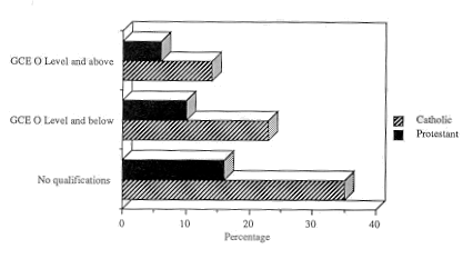 participation? A great deal of evidence exists on outputs from the education system in Northern Ireland (see section four). Broadly speaking the patterns identified can be summarised thus: leavers from Protestant schools have better qualifications and are more likely to enter employment than leavers from Catholic schools. Two contrasting patterns are that proportionately more leavers from Catholic schools have no formal qualifications while proportionately more pupils in Catholic schools remain in education beyond the compulsory age. Finally, there are curriculum differences such that pupils in Protestant schools are more likely to take science and technology subjects for examination, while pupils in Catholic schools are more likely to take humanities subjects. These patterns would seem to imply some mediating role for educational processes in employment opportunity. However, Murray and Osborne have pointed out that such links are by no means direct. Cormack et al. (1980) and Murray and Darby (1980), for example, suggested that factors other than simply qualifications mediated entry to employment. Also, Cooper (1981) has pointed out that, at least in the past, Catholics did not fare well in the civil service, where qualifications in humanities subjects ought to have been a benefit. Evidence on graduate employment (Miller at al., 1990: see section four) suggests that religious differences in employment level can be linked to the degree subject taken, which in turn can be linked to curriculum differences between Protestant and Catholic schools. It should be noted, however, that this evidence deals with a narrow sector of the labour market and with employment level achieved rather than unemployment per se.