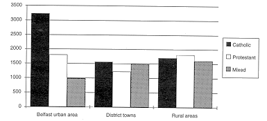 of Protestant leaving public housing for owner occupation. As mentioned above the PSI report was an attempt to answer questions related to equality of access for Catholic and Protestant households, the quality of dwellings occupied, and the effect of the housing system on the process of segregation. The limitations of the data used in the PSI assessment meant that "The results shed light on these questions, though ... they cannot answer them conclusively." (Smith and Chambers 1989 p56). Allowing for the problems caused by the nature of the data, the PSI concluded that while a higher proportion of Catholic households live in public sector housing, those on the waiting list wishing to live on a Catholic estate have a lower chance of being rehoused than those preferring Protestant estates. The broad finding on the question of the quality of dwellings was that there were significant differences, in a number of areas, in the state of repair and dwelling standard of Catholic and Protestant estates: "in the Belfast urban area, Catholic public housing estates are in a considerably worse state of repair than Protestant or mixed estates, and they also require more improvement to bring them up to the basic dwelling standard." (Smith and Chambers 1989 p57). In district towns Catholic estates tended to have a better dwelling standard. In rural areas Protestant estates tended to have the highest average improvement costs. The PSI report noted that there was more segregation in public sector housing than in the private sector. Smith and Chambers speculated that one of the reasons for this may be due to the fact that new public sector housing has been built in perceived religious territories rather than on neutral ground. Another reason may be that the large scale of public housing estates may make it easier for the entire estate to become identified as the 'property' of one section of the community. The Report also suggested that segregation may be an artefact of the bureaucratic process of housing allocation: "It is also possible that the allocation system eventually comes to accept segregation as the norm in many areas, and therefore excludes certain options from consideration altogether." (p57). In terms of equality of treatment by the NIHE the PSI report concluded that "There is no evidence from the findings of this study of direct or intentional discrimination, nor of indirect discrimination, by the Northern Ireland Housing Executive against Catholic applicants or tenants." (p58). In the subsequent SACHR Report the main findings, discussed above, were briefly noted. By way of potential explanation for some of the findings of the PSI report, SACHR detailed the particular extraordinary circumstances that the NIHE was forced to operate up to that point: