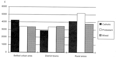 Data for Figure 8.2 Improvement costs also tended to be higher on Catholic estates in Belfast. In the district towns the improvement costs (see Figure 8.3) on Protestant estates (£3,366) tended to be worse than Catholic estates (£2,895), white there were only marginal differences in the average repair costs. In rural areas the repair costs were similar, but Protestant estates had the higher improvement costs (Protestant £5,173, Catholic £4,137). The PSI report makes the point that differences in the age and structure of estates in Belfast should, other things being equal, have the effect of producing higher average repair costs on Protestant estates. it is conceivable that some repair may be required as a result of the larger average family size found in Catholic estates, but it is unlikely to account for the level of difference mentioned above.