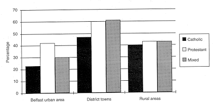 religion of estate, 1985-86 Data for Figure 8.3 Access to public housing The PSI again faced problems in trying to answer the question of whether or not there was equal access to public sector housing for Catholics and Protestants. The point was made in the report that the best information would be found by following a pool of subjects who went through the allocation process. The only information that was available, however, was that collected as part of the housing management system. While this meant that: "the records can be used to give a snapshot of the waiting list on a particular date, and to provide a description of allocations over a given period", here was the limitation that "they cannot readily be used to provide an analysis of the flow from the waiting list into public housing." (Smith and Chambers 1989 p36). This limitation was to have a large effect on the quality of this part of the analysis undertaken by the PSI. The report began by describing the background the Housing Executive's Housing Selection scheme from the system inherited from the NIHT. he selection scheme underwent a number of major reviews and also many adjustments. It has to be remembered that decisions regarding the weighting of elements within a points system are subjective. Furthermore, given the many differences in the characteristics of Catholic and Protestant households, these decisions are likely to have a differential impact on the two communities. The PSI report also made the point that the decisions taken in the process of matching the neediest applicant to a suitable dwelling "may be guided by rules, but these rules do not (and cannot) uniquely determine particular decisions." (p37). As an example of this the Report mentions the "flexible adjustment or bargaining" that can take place when an applicant is visited by their focal housing assistant. The waiting list as operated by the NIHE is divided into the A or priority list containing those in greatest housing need and the general or B list. Points are allocated to applicants for circumstances such as the sharing of facilities, a lack of amenities, overcrowding or focal preference points. Partly as a result of more recent homeless legislation the current situation is that a majority of allocations, approximately 60 per cent, are made to priority cases. The methodological approach taken by Smith and Chambers was to compare allocations during 1987 with the waiting list at the end of that year. During 1987 there were 5,137 transfer allocations of existing NIHE tenants and 9,359 allocations to new applicants. Religion was assigned to applicants according to whether the estate they selected was assessed to be Catholic, Protestant or mixed. This procedure was necessary because the majority of people who complete an application form for the Housing Executive do not answer the voluntary question on religion. (However, as housing allocations are the responsibility of local housing managers who have good knowledge of their area, it is very likely that they are aware of the religion of each applicant from other details on the application form.) The analysis of allocations broken down by the points earned revealed a wide range with 5 per cent of dwellings going to households with 10 or fewer points. The segregation of housing was assumed to be one possible explanation for difficulties in matching dwellings to applicants. When allocations during 1987 were considered as a percentage of the waiting list at the end of the year a fairly clear pattern appeared: see Figure 8.4. In the Belfast urban area, and to a lesser extent in the district towns, there was a marked difference between allocations to Catholic and Protestant estates. The biggest differential was in the Belfast urban area were allocations to Catholic estates were 23 per cent of the waiting list whereas the equivalent figure for Protestant estates was 42 per cent. In district towns the figures were 47 per cent Catholic and 60 per cent Protestant. These differences existed despite the evidence that Catholic housing need was greater than Protestant need during the same period.