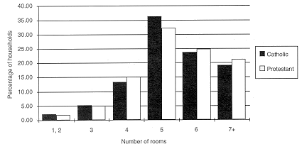dwelling size by religion, 1991 Data for Figure 9.1 There have been substantial improvements in the figures for density of occupation. In 1971 the figures for those households living over a density of one person per room were 29.3 per cent for Catholics and 9.8 per cent for Protestants. By 1991 these figures had become 9.6 per cent and 2.2 per cent respectively. Among Housing Executive tenants, 11.9 per cent of Catholic households were living at one or more persons per room and the equivalent figure for Protestant households was 3.6 per cent. While these figures represent substantial improvements on the situation in 1971 it would appear that the NIHE is still having difficulties coping with the larger household size of Catholics families.