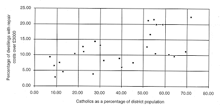 As mentioned earlier the NIHE has carried out regular HCSs since 1974. A central part of the assessment of housing condition is whether or not the dwelling is statutorily unfit. For the purposes of the surveys carried out in 1974, 1979, 1984 and 1987 the standard for unfitness was the same and was based on the 1956 Northern Ireland Housing Act (amended by the 1971 Housing Act and the 1981 Housing (NI) Order). However the standard was substantially changed for the 1991 HCS (in line with changes in England); the legislation concerned was the 1992 Housing (NI) Order. The change has had the effect of breaking the continuity of comparison between the 1991 survey and the earlier ones. However the NIHE have provided estimates of the effect the new standard is likely to have had on the 1987 level of unfitness. The first of the HCSs in 1974 found an unfitness level of 19.6 per cent and by 1987 this figure had been reduced to 8.4 per cent. Using the new standard for assessing unfitness the NIHE have recalculated the 1987 figure and, other things being equal, it is estimated that 11.0 per cent of dwellings would have been unfit in 1987. The 1991 survey found unfitness to be 8.8 per cent of the housing stock. It would appear therefore that making an allowance for the new standard the level of unfitness in the Northern Ireland housing stock has continued to decline. It is clear from an inspection of the unfitness data for the district council areas that there remains an important element of variation in the figures across the region. The lowest level of unfitness was 2.5 per cent in Castlereagh while the highest was 23.3 per cent in Fermanagh (NIHE 1993). This pattern reflects the rural nature of unfitness in the region and in particular that proportion of the housing stock which is located in isolated rural areas. Evidence from the 1991 survey showed that approximated one-third of all farm dwellings in the region were unfit. Figure 9.7 shows the association between the percentage of dwellings in each district council which are unfit and the percentage of Catholics living in the particular area. As mentioned previously this type of association based, as it is, on area data can not prove a relationship between religion and housing condition at the individual household level. However it is likely that observed pattern reflects the pattern of owner occupation of older dwellings among Catholic families living in rural areas in west and south of the region.