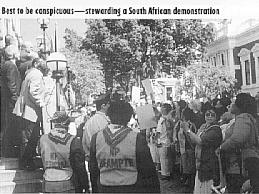 The guidelines also suggest that observers should identify themselves by means of an arm-band or similar and should introduce themselves to the organisers of the event upon arrival. There is no suggestion that they should introduce themselves to the police; rather, the implication of the guidelines is that the observers should maintain as much distance from the police as possible. The guidelines also state that observers should neither become involved in crowd control nor conflict resolution, nor should they act as liaison with police officers. This work is considered to be the responsibility of the event organisers. Legal observers may liaise with the organisers but should remain distant from them. Both documents indicate suspicion of police motives in trying to utilise legal observers as intermediaries, which might compromise their status as independent witnesses should they be required to appear in court. The New York Guild guidelines take a rather different approach and state that there is no set way for a legal observer to act at the demonstration. In contrast to the previously cited guidelines they say that the observer should keep in mind that their job is to assist the demonstrators in accomplishing their objectives (short of counselling persons to break the law). Observers should do whatever they can to achieve the aim of the demonstration, by their presence or by negotiating with the police. Under these guidelines legal observers are expected to see themselves as a part of the demonstration rather than as witnesses. They function as an authority rather than as an independent and neutral third party. They provide advice to event participants and challenge the legal knowledge of the police. There is less emphasis on the importance of note-taking or monitoring arrestees, which it is felt can be done by others. The models set out in these guidelines suggest two very different roles for legal observers. The San Diego/San Francisco model advocates a passive approach at the event itself, with any intervention taking place publicly - producing reports or acting as an independent witness in court. The aim is to create a distance both from the organisers of the demonstration and from the police, in a similar way to Sheffield Policewatch. Emphasis is placed on the impartiality of legal observers because of their legal training and, as a consequence, the honesty of their observations. The New York model is more interventionist. Observers are clearly expected to identify actively with the aims of the demonstrators. Legal knowledge is seen as a tool which can be utilised to achieve ones aims , to restrain police action or to assist people in practical ways after they have been arrested, rather than as a claim to truth and objectivity. Both models see clear demarcation lines between demonstrators and police. They regard legal observers as on the side of the demonstrators, as active supporters or as independent monitors of civil rights. Neither approach advocates any neutrality or any role in mediating between police and demonstrators to achieve a peaceful compromise. Both models also take an almost fatalistic view that demonstrations will involve arrests and probably violence. Although in the past US police have often taken an aggressive stance to radical demonstrations, more recent academic studies suggest that this approach has changed towards a softer, less confrontational, amidst a negotiated and more ritualised style of protest (McCarthy and McPhail 1998, MePhail et al 1998). However, this change is not reflected in these guidelines. South Africa: monitoring demonstrations There were extensive problems of violence at demonstrations in South Africa during the last years of the apartheid regime and through the transition to democracy. For much of this period all demonstrations were illegal and the police took an aggressive approach to dispersing any illegal gatherings. Many people were killed or injured at such events (Jeffrey 1991). During the transition, the number and frequency of demonstrations increased. So, too, did the violence, but with the addition of a new element - clashes within the black community between rival supporters of the African National Congress (ANC) and the Inkatha Freedom Party (IFP). The police were in no position to mediate in such disputes as they were regarded as an antagonist by both parties.