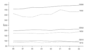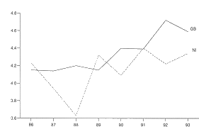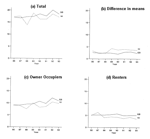 As to the pattern over time, Figure 1 also shows that the rich in Northern Ireland have indeed become richer, at a rate similar to their counterparts in Britain.[2] Thus, in 1987-93, in Northern Ireland the rich increased their weekly income from £334 to £384 - a £50 increase - while in Britain the corresponding rise was £410 to £445. On the other hand, the income of the region's poor has changed only marginally, rising from £85 a week to £88 - just £3 - in the same period; comparative figures for Britain are £99 and £97 respectively. A simple measure of inequality is the income of the 90th percentile divided by that of the 10th, as presented in Figure 2. In 1988 this ratio was 3.63 for Northern Ireland: the rich received over three and a half times the income of the poor. By 1993 this had increased to 4.34. This mirrored what was happening in Britain, where the ratio rose from 4.14 in 1987 to 4.72 in 1992. A more sophisticated index of inequality, called the 'mean logarithmic deviation',[3] is represented in Figure 3a. On the vertical scale, the higher the measure the greater the inequality. The index is actually usually slightly higher for Britain than Northern Ireland, indicating greater inequality there. One advantage of this index, however, is that it can be broken down according to social groups. Decomposing it by housing tenure gives a rough-and-ready representation of the role of social class-given the relative tendency of middle-class respondents to be owner-occupiers and of working-class respondents to be renters. Figures 3b and 3c show how much of the inequality set out in 3a can be explained by the inequality amongst owner-occupiers (3c) and that amongst renters (3d). What is left is contained in 3b: how much inequality there is between the two groups taken as a whole, when their mean (average) incomes are compared.