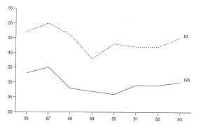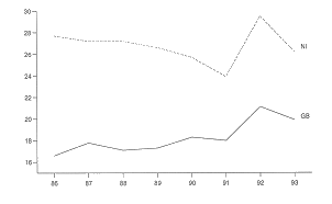 ![]() The over-60 category accounted generally for over one third of the poor in Britain, whereas in Northern Ireland the fraction varied between a fifth and a quarter. The position is reversed when we consider the unemployed. While unemployment in Northern Ireland achieved a minimum in 1990, its rate of 13 per cent was more than double that of the UK as a whole (5.8 per cent). Since then, the two areas have had disparate experiences; in the UK unemployment rose sharply to 10.3 per cent in 1993, whereas in Northern Ireland the increase in the same period was much more modest, to 13.9 per cent. Before 1990, the unemployment rate in Northern Ireland was 6-7 per cent above the UK average, so the greater proportion of families on low incomes classified as unemployed in the FES is not surprising. Despite major differences in incomes, the extent of inequality in Northern Ireland is not radically different from Britain, though there is some evidence of a more entrenched class structure. Both have experienced widening inequality in the past decade, with the rich becoming richer more rapidly than the remainder of society.