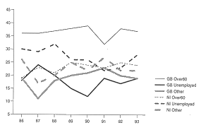 given living standards rise over time? One answer is to establish a relative poverty line, such as 50 per cent of mean UK income. In Britain this was £119 per week in 1986 and £128 in 1993. Other percentages could, of course, be chosen, but neither the extent of poverty in Northern Ireland, relative to Britain, nor its composition seem unduly sensitive to the precise level selected. By this standard, Figure 4 shows that the poor comprise a greater proportion of the population in Northern Ireland. In 1992, 30 per cent of people in the region were on incomes below 50 per cent of the UK mean, compared with 21 per cent in Britain. While this is hardly surprising, given the difference in mean weekly incomes (£220 and £256 respectively in that year), it means almost a third of people in Northern Ireland are below the poverty line, compared with a fifth in Britain.
