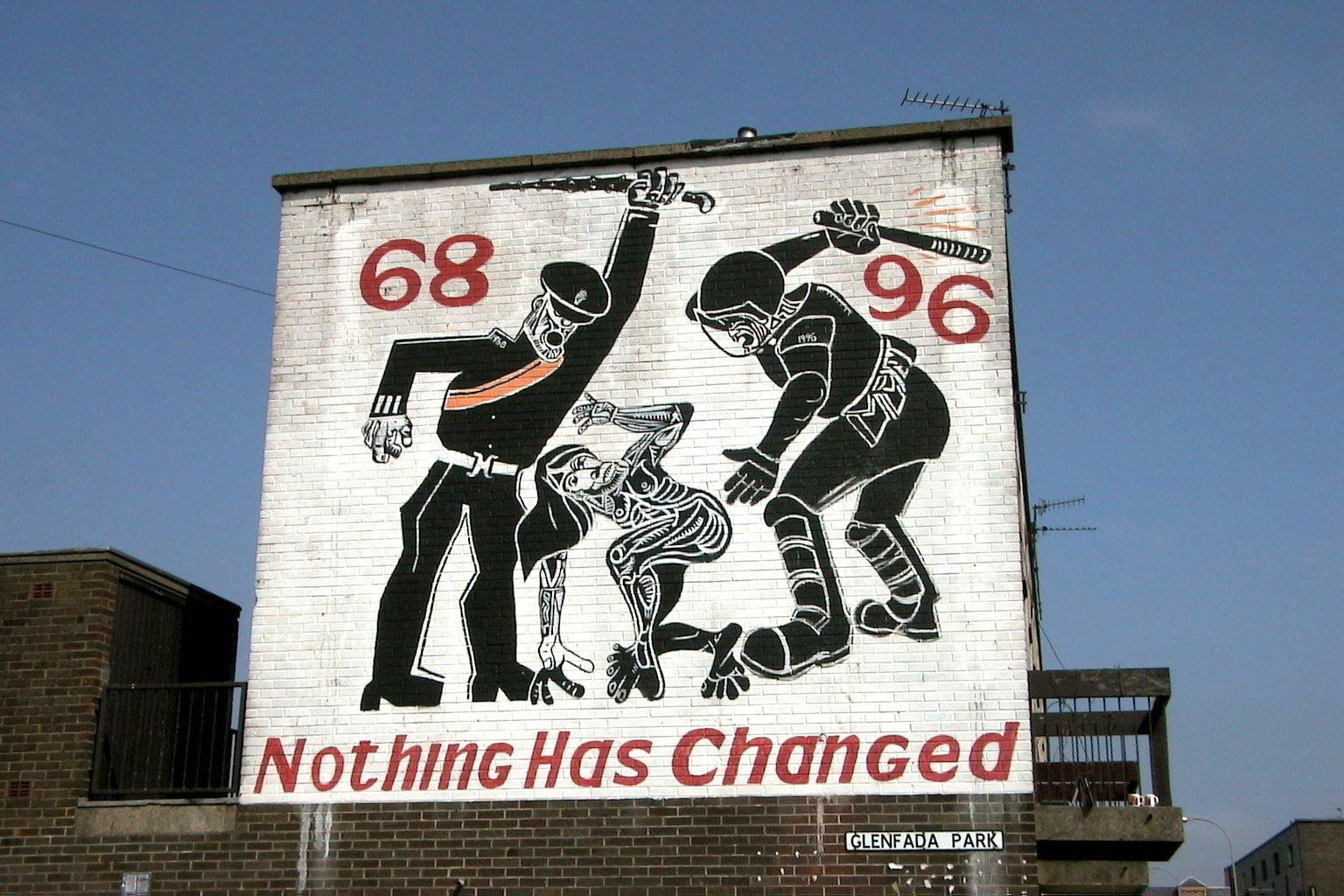 One of the murals in the Bogside area of Derry. The mural painters compare the treatment of Nationalists at the hands of the security forces in 1968 and in 1996 (during the Drumcree dispute) and conclude that 'Nothing Has Changed'. large JPEG image - 280K