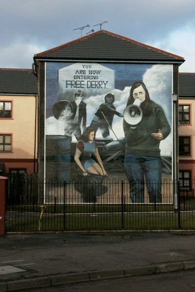 One of the murals by 'the Bogside Artists' in the Bogside area of Derry. The mural depicts scenes from the 'Battle of the Bogside' that took place during August 1969. The figure on the right is Bernadette Devlin. large JPEG image - 254K