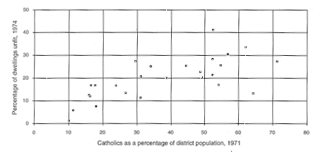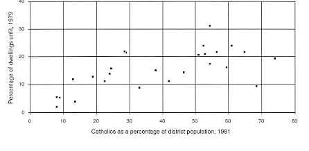 The unfitness rate varies considerably from District to District. It is highest in Fermanagh where 41 % of all dwellings are unfit and 57. 1 % of all dwellings were built prior to 19 1 9, and lowest in Castlereagh where 1% of dwellings are unfit and 87% were built after 1944. Within these two extremes there are Districts with disturbingly high unfitness rates. In Newry and Mourne the rate is 27%, in Belfast 24%, Coleraine 16%, Ballymoney 27%, Omagh 34% and in Craigavon 20%. Districts with lower unfitness rates are North Down 6%, Londonderry 13%, and Antrim 11 %. (NIHE 1974 p7). A comparison of the distribution of unfit dwellings (Figure 4.3) and the population of Catholics (Figure 3.1) in each district council area does give the impression of higher rates of unfitness in those areas with a high Catholic population. Figure 4.4 is a plot of the level of unfitness by the percentage of Catholics in each of the 26 district council areas. It demonstrates a strong association between the proportion of Catholics and the level of unfit housing. While it is true to say that this assessment does not provide direct evidence of higher rates of unfitness in individual Catholic dwellings, when looked at in association with other information it is highly probable that this was indeed the case.