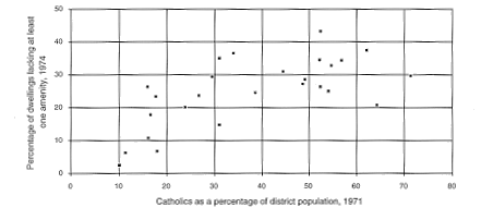 The report of the 1974 HCS give a description of the typical unfit dwelling stating that it was: "...a terraced or detached house built prior to 1919, is owner occupied or privately tenanted, lacks at least four amenities ... is in a state of high disrepair, and has a net annual valuation less than £14." (NIHE 1974 p8). Each of the HCSs conducted by the Housing Executive have demonstrated the close association between amenity provision and unfitness. The 1971 Census data, considered in Section Three, gave clear evidence that Catholic households were significantly less likely to have exclusive use of a fixed bath, an inside toilet, or hot water, than Protestant households. Figure 4.5 shows the percentage of dwellings lacking at least one amenity, according to the 1974 HCS, and the percentage of Catholics in each of the 26 district councils. As with unfitness there is a strong correlation between those areas with large Catholic populations and the provision of amenities in dwellings.