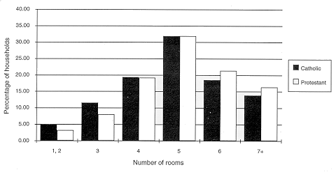 used in this Section. The differences in tenure of occupation between Catholics and Protestants reported in the 1981 Census were broadly similar to figures for 1971. The biggest single change for both communities was the steep decline in the private rented sector, but the relative position within this sector was roughly similar with fewer Catholic households (6.3%; down from 16.1% in 1971) being private renters compared with Protestant households (10.4%; 20.5% in 1971). The other main changes were an increase in the size of the public rented sector with the biggest increase being among Catholic households (Catholic households 47.7% up from 40.9%, Protestant households 36.8% up from 32.2%), and also an increase in the owner-occupied sector, more so amongst Protestant households (Catholic 44.7% up from 42.3%, Protestant 51.6% up from 47.8% in 1971). While it is evident that there was a decline in the average household size between 1971 and 1981 for both Catholics and Protestants, Catholic households remained larger at 3.76 persons compared with 2.92 for Protestant households. This difference in average household size continued to be reflected in the average number of persons per occupied room, with Catholic households living in more overcrowded conditions at 0.75 persons per room compared to Protestant households at 0.56 persons per room. This difference was greatest at the higher levels of density with over three times as many Catholic households (19.6%) living at a density of over one person per room than Protestant households (6.0%). An examination of public sector tenants shows that Catholic households were much more likely to be living at densities of one or more person per room than Protestant households (23.7% and 9.8% respectively). Data on the distribution of dwelling size showed a general reduction in the percentage of households living in smaller properties and an increase in those living in houses with five or more rooms. In addition to this improvement there was also a reduction in the discrepancy in dwelling size between Catholic and Protestant households during the ten years since the 1971 Census: see Figure 5.2 (a comparison with Figure 3.2 shows the obvious changes). It should be noted that Catholic households remained more likely to occupy smaller dwellings and less likely to occupy larger ones.