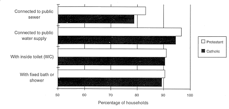 During the time this improvement was being secured the Housing Executive was applying the criterion of need to decisions on its housing programme. It could be argued, therefore, that the information on the substantial improvement in the relative position of Catholic households provides circumstantial evidence that objective measures of need were not being applied to considerable number of households in the period up to 1971. In the owner-occupied sector and the private rented sector it could be claimed that Catholic households chose to live in dwellings with fewer amenities. A more credible explanation might be that they could not afford to purchase or rent the accommodation in better condition. The economic differences between Catholics and Protestant households, particularly with regard to employment and income, may have been the determining factors in the differentials in most housing characteristics.