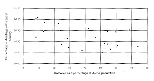 A similar approach was taken to the data on the provision of public water supply and public sewer. The supply of public services to dwellings tends to be dependent on how remote they are with those in rural areas being less likely to have water and sewer facilities. An examination of the data on connection to the public water supply revealed that the greatest disparity tended to be among those councils where the overall provision is lowest. Due to the effect of the urban/rural spread it is not possible to say whether the lower rate of provision, for example, among Catholic households in Fermanagh, is on account of more Protestant households living in urban areas. Information on the availability of central heating within dwellings was collected for the first time during the 1981 Census. Figure 5.5 shows the distribution of central heating across the 26 district council areas. It is clear that there is a disparity between areas which may be partly accounted for differences in the tenure mix. Whatever the cause the data reveal a moderate negative association between the number of Catholic households in an area and the availability of central heating.