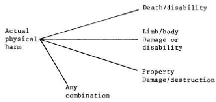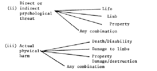 | (i) induced psychological insecurity (ii) induced psychological threat (iii) actual physical harm to people or property (iv) any combination of (1) (ii) (iii) |