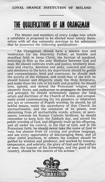 Needless to say, no Catholic has every been allowed to join the Orange Order. Indeed, every Orangeman was also obliged in the 'Qualifications' to oppose Catholicism and: