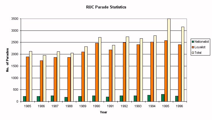 The statistics below illustrate the number of Loyalist and Nationalist parades which have taken place annually in Northern Ireland over the past ten years. The figures have been taken from the Report of the Independent Review of Parades and Marches (page 30), and were initially obtained from the RUC.