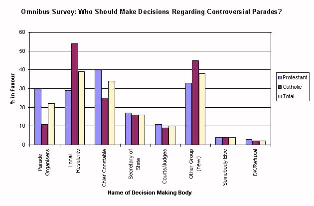 In September 1996, an Omnibus Survey was conducted in Northern Ireland, partly commissioned by the Police Authority. It included twelve questions on Public Attitudes to Policing. One of these referred to the question of responsibility for decisions regarding controversial parades in Northern Ireland. The graph below illustrates the responses of Catholics and Protestants to the various decision making bodies suggested.