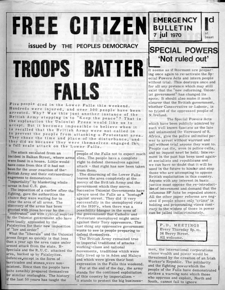 There were riots in the Springfield Road area of Belfast following an Orange parade. The British Army used 'snatch squads' to make arrests of Catholic youths. The confrontations were intense with 38 soldiers injured together with an unknown number of civilians. The Army used CS gas for the first time in large quantities.