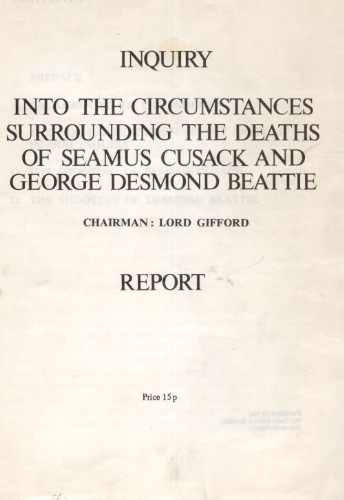 'Inquiry into the Circumstances Surrounding the Deaths of Seamus Cusack and George Desmond Beattie', by Lord Gifford (1971)[Key_Events] [Key_Issues] [CONFLICT_BACKGROUND] BACKGROUND: [Acronyms] [Glossary] [NI Society] [Articles] [Chronologies] [People] [Organisations] [CAIN_Bibliography] [Other_Bibliographies] [Research] [Photographs] [Symbols] [Murals] [Posters] [Maps] [Internet]