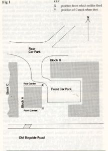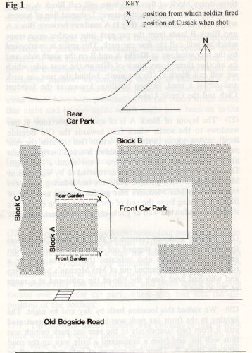 three-storey block of flats, which we will call Block A, and in front and on the right is a two-storey L-shaped line of houses. which we will call Block B. (Fig 1) A roadway between Block A and Block B leads from the car park into another open space which we will call the rear car park. This space is overlooked by the rear windows of Blocks A and B on the south side, and by another three-storey block of flats on the west side, which we will call Block C. To the north, behind the rear ear park and across a road, lie two buildings known as the Stardust Club and the Credit Union. (27) The layout of Block A is of special importance. It has windows to the south which face towards the Old Bogside Road, and windows to the north which face towards the rear car park. Beneath each set of windows is a small strip of grass about 9 feet long, bounded by low walls about a foot high. The south-facing strip of grass was referred to by witnesses as Mrs Meenans front garden, while the north-facing strip was referred to as Mrs Meenans rear garden. On the east side of Block A running from the end of one garden to the end of the other is a windowless wall or gable-end about 25 feet in length. (28) All the evidence pointed to the fact that Cusack was shot when he had just stepped out from Mrs Meenans front garden. The evidence also indicated that he was shot by a soldier who had just stepped out of Mrs Meenans back garden and who had fired down the line of the gable-end at a range of 20-30 feet. (29) We visited this location both by day and by night. The lighting in the front car park was fair. Some light penetrated into it from two lampstands in the rear car park (which was thus well lit), and from a lampstand a little way up the road opposite Block A. These two sources of light were cut off on each side by the corners of Block A, so that a triangle of shadow was formed along the gable-end. (30) On the night of our visit a lampstand directly opposite the front car park was not working. Witnesses could not recall whether it was functioning on the night of the shooting; but from the evidence of Miss McCafferty, who remembered the triangle of shadow, we concluded that in all likelihood it was not. On the other hand further general illumination of the scene would have been provided by the full moon which shone that night and by any lights which might have been on in the flats in the vicinity. (31) It follows that both Mrs Meenan's front garden, from which Cusack stepped out, and Mrs Meenans back garden, from which the soldier stepped out, were reasonably well lit on the night of the shooting. However, the soldier might not have had a distinct view of his target, particularly if Cusack was moving forward at the time into the triangle of shadow. The Witnesses to the Inquiry (32) We received evidence from twenty-four persons, of whom eighteen were eye-witnesses either to the shooting itself or to the movements of Cusack and the soldiers in the moments immediately preceding the shooting. Eleven of these eye-witnesses testified as to having looked out on to the front car park where they had seen Cusack, and seven spoke of having looked over the rear car park, where they had seen the disposition of the soldiers. (33) The incident under inquiry was unusual in that it took place within an arena of houses, occupied by persons who had, as it were, a ringside view of the proceedings without themselves being participants. Ten of the witnesses who testified before us fell into this category. They came from all the blocks in the vicinity and were able to see the crucial events from a variety of angles. Most of them indicated that they disapproved of stone-throwing at the soldiers, though one spoke of our boys when referring to the crowd confronting the soldiers. The other eight eye-witnesses were standing in the open at the time of the shooting, mostly at a safe distance in the Old Bogside Road. Two of these were respectively a journalist on the Irish Times and a schoolteacher friend, neither of whom appeared to be in any way connected with the disturbances other than as observers; on the other hand, three of the witnesses might well have been involved in stone-throwing. The witnesses gave their evidence in considerable detail and answered questions freely. There was nothing in their demeanour to indicate in any way that their stories were rehearsed, nor in general did they give the appearance of straining their evidence. Many of them were in fact most impressive, and the case that emerged from their evidence was a compelling one. We are grateful to all those who came forward to testify, and who enabled us to conduct an extensive inquiry. The Movements of Cusack and OHagan (34) On the basis of the evidence we received, we can plot with reasonable accuracy the events which immediately preceded the shooting. Some of the soldiers had moved into the area of the rear car park, and a Saracen armed car had been placed somewhere near the opening into the front car park. A section of the crowd from the Little Diamond had gone up to the Old Bogside Road, opposite Abbey Park, and a small group began to throw stones in the direction of the soldiers. (35) All the witnesses emphasised that the stone-throwing at this stage was very much less intense than it had been previously, with only a handful of youths taking part. It was not an open confrontation; rather a period of desultory activity by youths lobbing stones at targets which were generally out of sight and out of immediate range. The impression given by the witnesses was that the soldiers lay more in ambush than under siege. (36) At one point a lone soldier ventured around the gable-end by Mrs Meenans back garden and became visible to the people in the Old Bogside Road. One witness thought at the time that he was rather brave to do so. His helmet was knocked off, probably by a stone, and it fell to the ground near the gable-end wall. (37) A seventeen-year-old boy, Patrick OHagan, the
