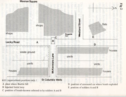 (71) The fatal shooting of Seamus Cusack during the previous night had clearly produced angry reactions from many local people. Protest marches were held and during the second of these, at about 2.30 p.m., there was heavy stoning of the troops at Butchers Gate. (72) At about 3 p.m. the commanding officer of the 1st Battalion of the Royal Anglian Regiment decided to send a detachment of troops to Foxs Corner, and a further detachment towards St Columbs Wells. The object was to capture some of the stone-throwers by means of a pincer movement. (Fig 2) (73) This led directly to the final confrontation of troops and civilians at the Lecky Road/Westland Street junction. The crowd had run from Butcher's Gate, down Fahan Street and into this junction. To the north. towards Foxs Corner, the troops had taken up positions. They were accompanied by three or four armoured cars, one of which was rammed just north of the junction by a coal lorry. About 20 yards south of the junction, opposite McKeowns Lane, a hijacked lorry full of bricks had been placed across Lecky Road to form a barrier. The crowd, some in Westland Street and some around the brick lorry, stoned the troops for several minutes, after which the stoning seemed to slacken off. (74) This was the scene shortly after three oclock, when there occurred two or three explosions in quick succession under one of the armoured cars. Soldiers were of the opinion that they were caused by nail bombs. According to a witness watching from the Bogside Inn, a bomb-thrower came from Westland Street and ran back up it straight afterwards. The bombs injured four soldiers standing by the armoured car, one of them badly, It was a few seconds after the explosions that Desmond Beattie was killed. (75) It will be clear from this account that, in complete contrast to the Cusack case, the shooting of Beattie was preceded by an extremely serious and violent occurrence. It was not unreasonable for the soldiers to fear a further lethal attack, and not unreasonable, if a bomb-thrower was seen about to go into action, for them to use firearms against him, if not to kill, then at least to disarm him. The Armys Case (76) The Armys evidence regarding the actual shooting came from two soldiers who were identified only as soldiers A and B. Soldier A was an officer in command of a platoon of the Royal Anglian Regiment; soldier B a member of that platoon. Both were positioned near the Lecky Road/Westland Street corner, looking southwards along Lecky Road. (77) After the explosions, both men said that they saw about a dozen men around the brick lorry, 40 yards away, engaged in some form of conversation. About a foot away they saw another man in dark clothing and a lightish shirt, holding a dark object in one hand and a flaming object in the other. He was bringing the two objects together, and looking towards the soldiers as if for a target. Independently, the two soldiers aimed at the mans chest and fired. They were convinced that he was about to throw a bomb. (78) After the shots, at least one of which must have missed, the man stumbled and fell. The mans companions gathered around him and carried him off behind the lorry. No other shots, according to the Army evidence, were fired in the area at the time. Other Evidence at the Inquest (79) Aside from the soldiers testimony, significant evidence was as given by other witnesses. (80) Mr Beavis, of the Forensic Science Department of the Ministry of Home Affairs, stated that after making every possible test on Beatties body and clothing, he could find no incriminating evidence of any kind to suggest that Beattie had been in possession of a bomb. He had tested for traces of petrol and other volatile materials, nitro-glycerine and firearms discharge residue. Previous experience had shown that detectable amounts of nitro-glycerine had been discoverable in 50% of cases of men known to have handled nail bombs, and if a bomb had been in Beatties pockets then there certainly would have been traces. (81) Dr Marshall, the pathologist who carried out the post-mortem, said that a single bullet had entered the body on the left side of the chest and exited at the front of the right side of the chest, passing through the heart and causing instantaneous death. The angle of penetration was such that had the deceased been erect, the bullet must have been travelling upwards at an angle of 20° to the ground. (82) The Army log book revealed that the message relating to the shooting was received at 3.13 p.m. from a sub-unit commanded by soldier A. It read: Fired round at man who fired at him. Man was dragged off. Another message received from another commander at the same time read: ' Fired round at man who fired at him. Soldier A stated that immediately after he fired, he had ordered a message to be sent saying that a bomber had been fired at. (83) Miss Morrison, who was working in a chemist's shop in Meenan Square, saw a man fall about 20 yards south of McKeown's Lane. She thought he was standing about before he fell. At some point - she thought after the man fell - she saw a soldier looking around the corner at the far end of McKeowns Lane. The man whom she saw fell was undoubtedly Beattie. He was carried to the roadside and attended by Father Gillespie. The Evidence given to our Inquiry (84) Father Gillespie had been on holiday for a month with his family, who lived in the Lecky Road, about 70 yards south from McKeowns Lane. He told us that on the day of the shooting he had been walking home from Shipquay Street at about 2.30 p.m. and had stopped to observe the disturbances at Butchers Gate. He saw the crowd and soldiers gathering by Westland Street, and decided to make for his parents home via St Columbs Wells and McKeowns Lane. He saw troops in St Columbs Wells. He waited for a time at the bottom of McKeowns Lane, at the rear of the brick lorry. He was worried about a family who he knew were living directly next to the troops position and wonde