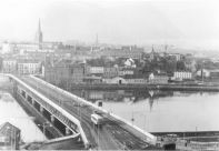 Looking across Craigavon Bridge from the Waterside, the tower and spires of St Columb's, St Eugene's, Austin's and Carlisle Road Methodist Church dominate the skyline.